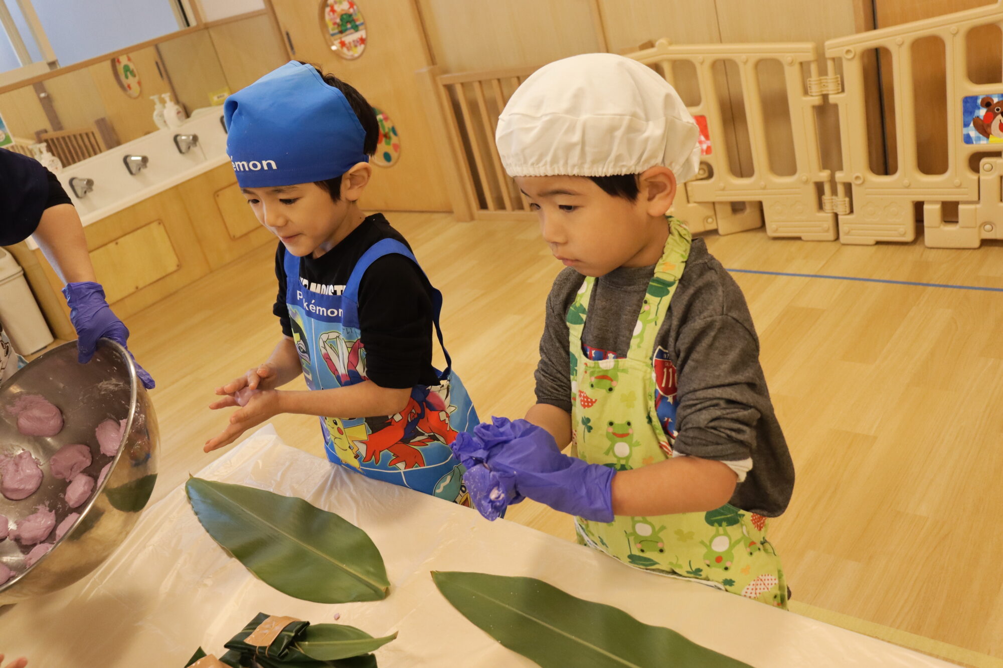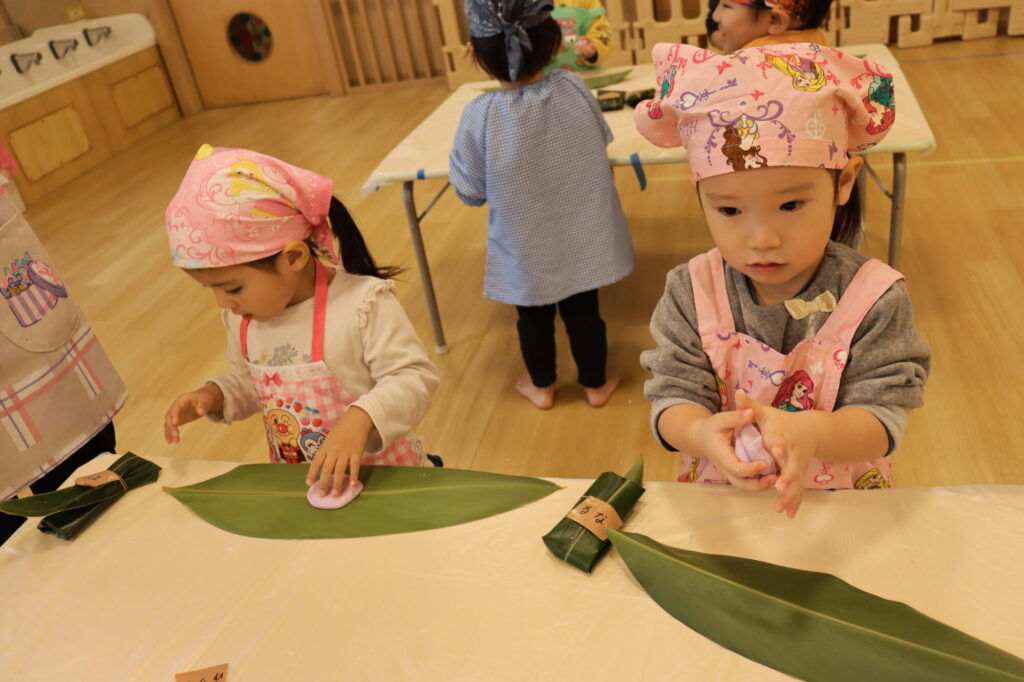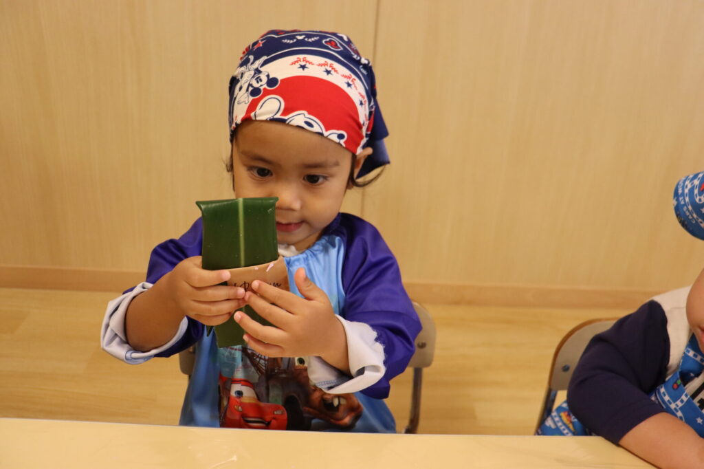 子どもたちは、月桃(サンニン)の葉の香りを感じながら、もち粉をこねたり、葉っぱで包んだりと、ひとつひとつの工程を楽しんで参加しました。