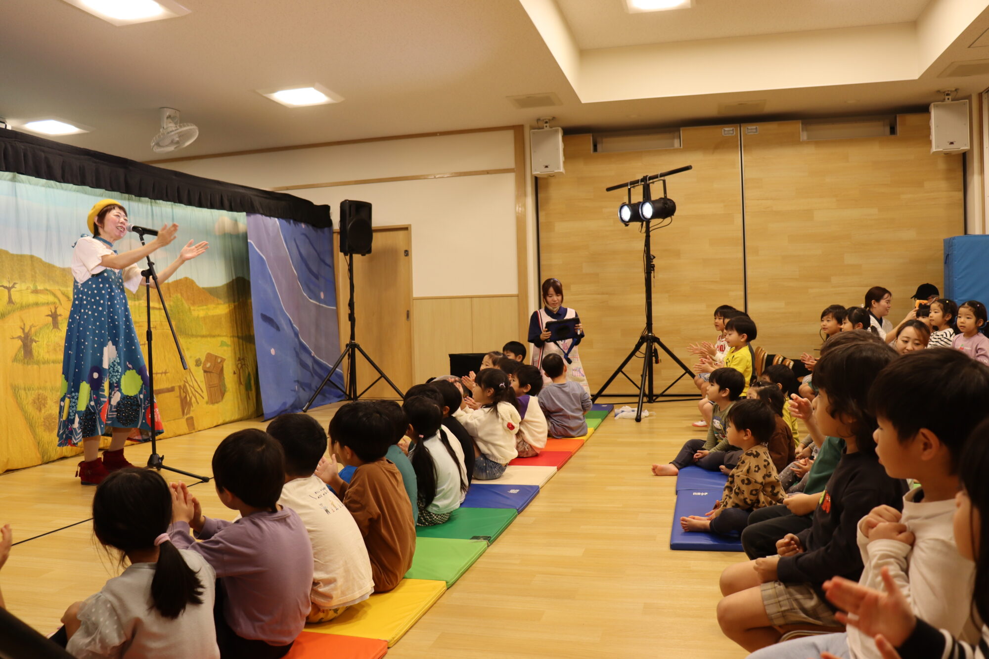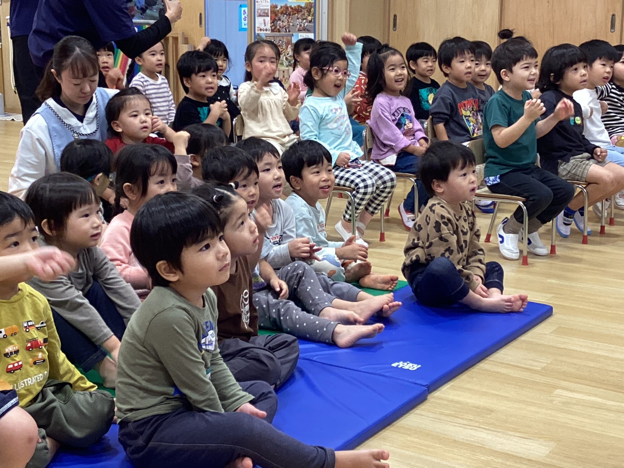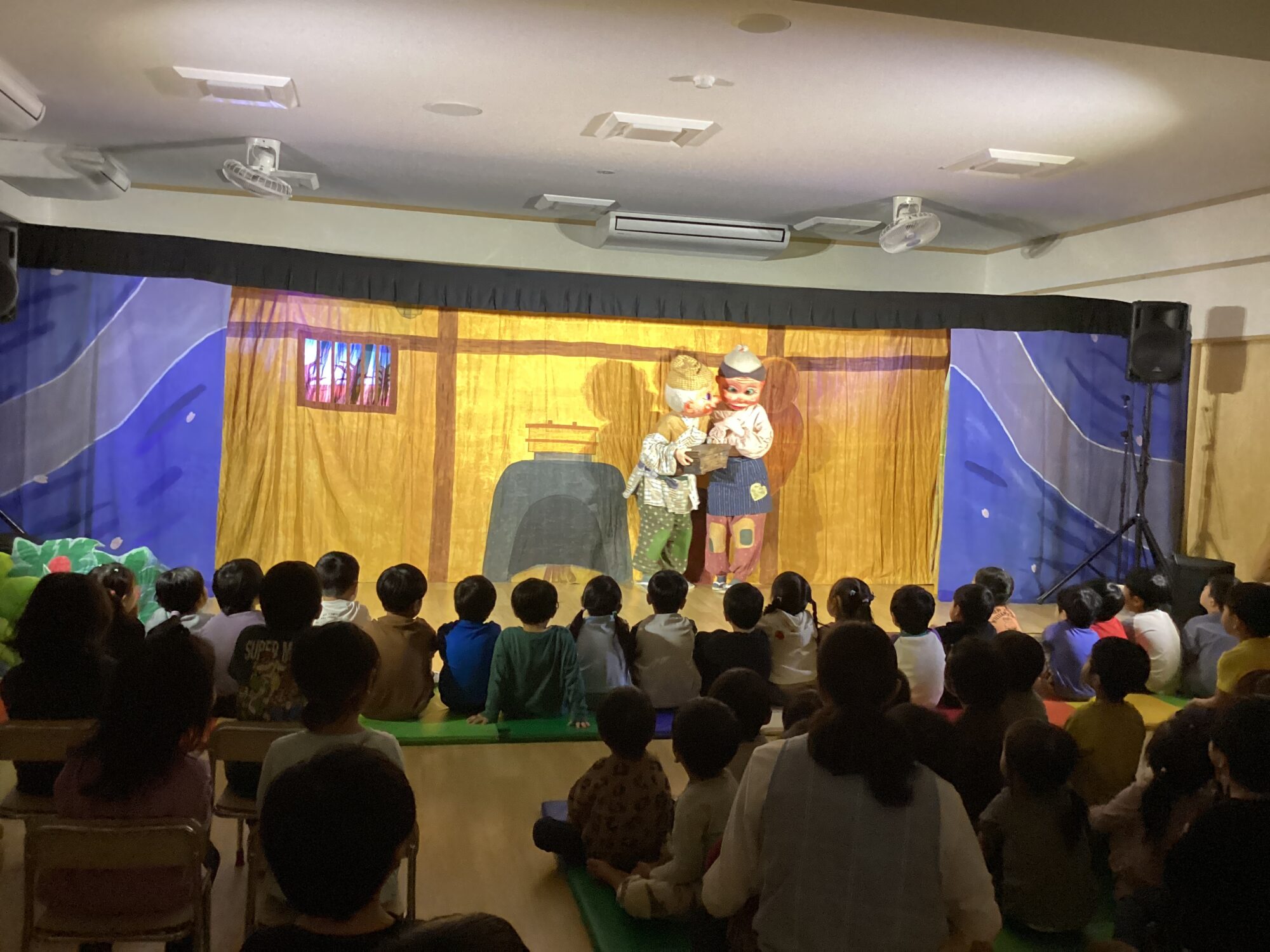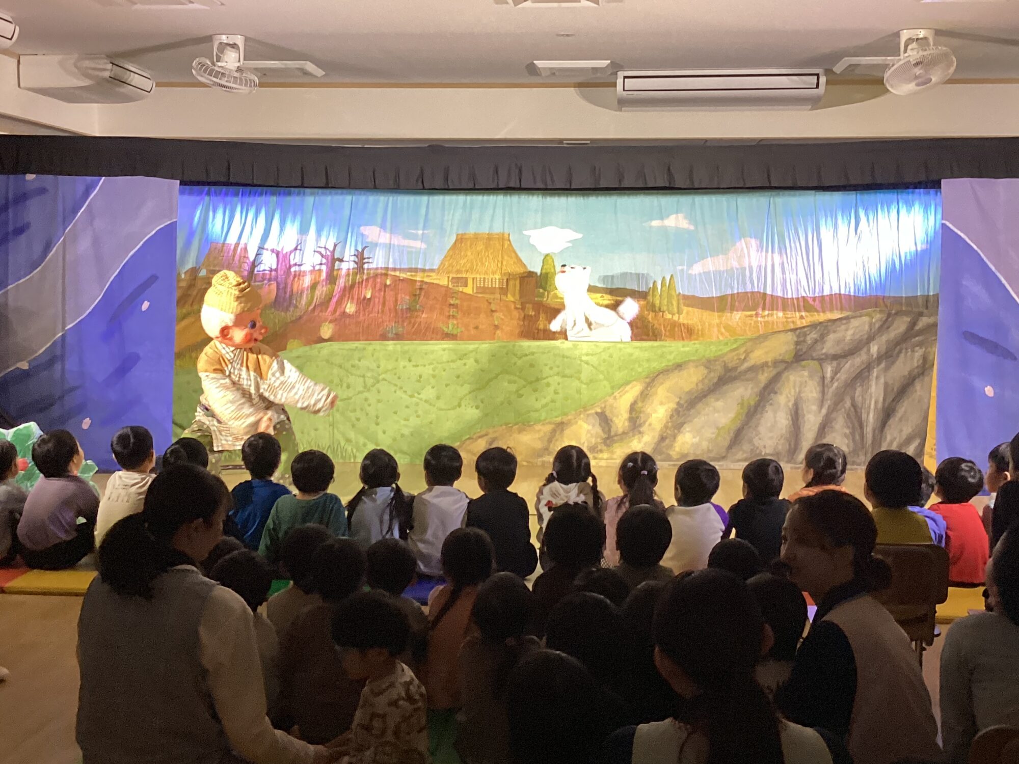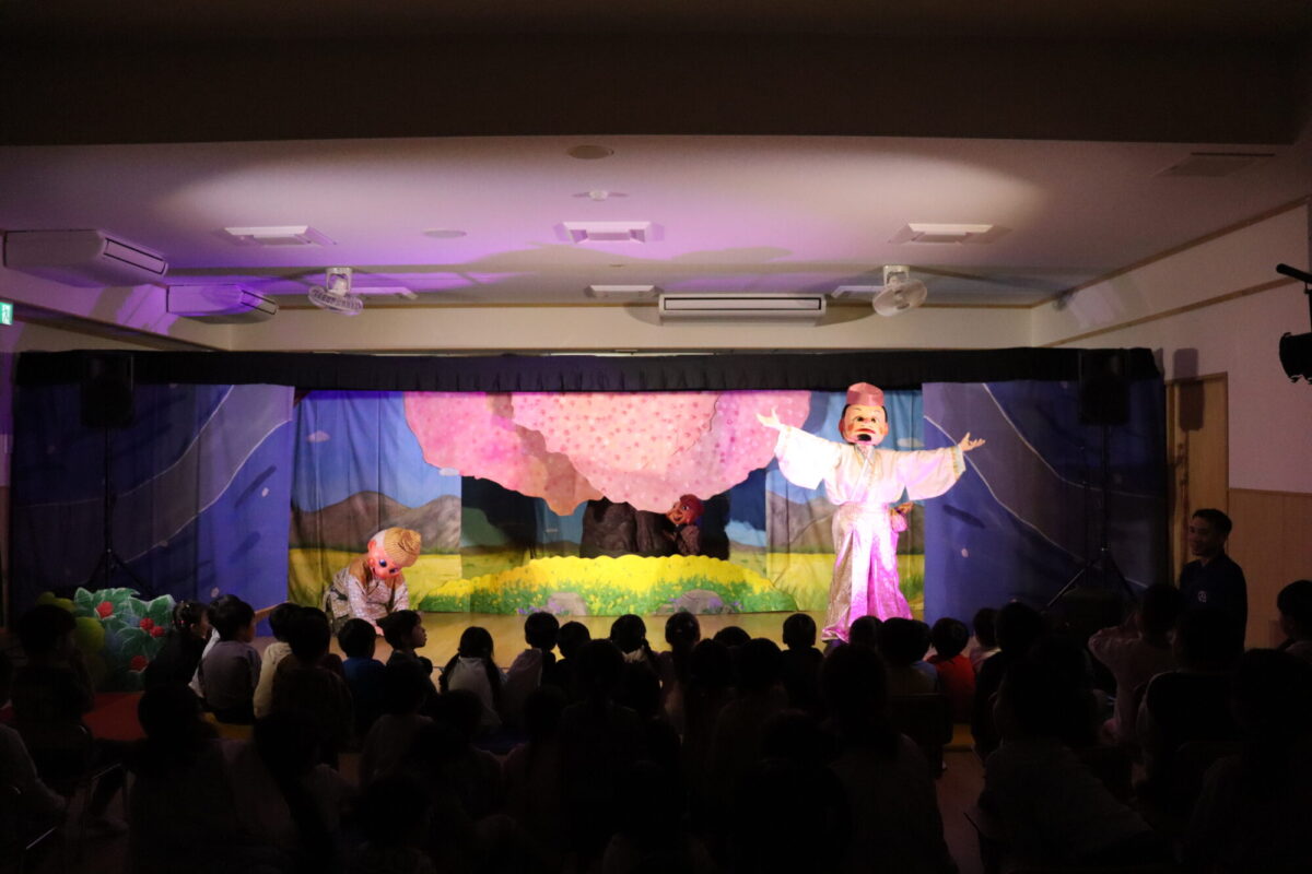 今日は、日本の昔話「はなさかじいさん」の観劇を楽しみました。軽快なやりとりや豊かな演技に、子ども達は物語の世界にぐっと引き込まれ、笑ったり、驚いたり、真剣な表情で見入ったりと、最後まで夢中になって観ていました